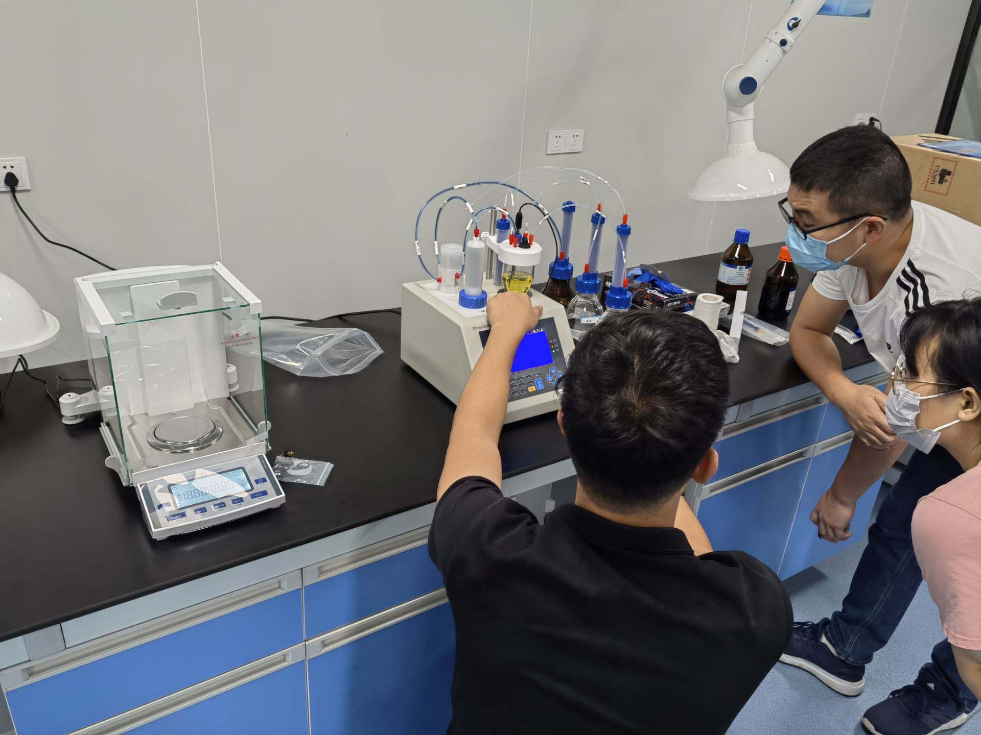 3.7、如果新加入的卡爾費(fèi)休試劑顏色顯示為淡黃色,表示試劑已經(jīng)吸潮,儀器界面中間不會(huì)顯示過(guò)碘,而是顯示“正在穩(wěn)定過(guò)正中,請(qǐng)等待”,此時(shí)不需要加水,等待儀器電解至平衡,顯示正常狀態(tài)即可。
