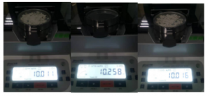 3、平衡后將樣品瓶移出,取出樣品,用電子天平稱取樣品置于樣品瓶內(nèi),然后在水分儀上點擊開始測量,同時將樣品瓶裝入加熱槽。