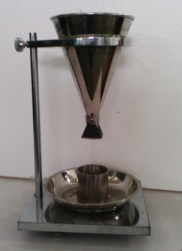 二、工作原理????將待測的磨料裝入漏斗,打開排放閥,磨料順著漏斗的下端口自然下落并流入到測量筒中,將落入到測量筒中的磨料刮平,在天平上稱取刮平后測量筒中的磨料質(zhì)量,再除以測量筒的容積,就可以測出待測磨料的堆積密度。
