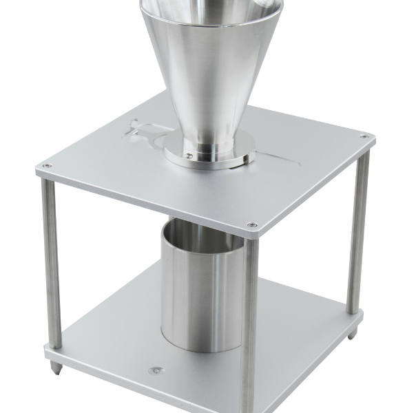 測定裝置原理:粉塵從漏斗口在一定高度自由落下充滿量杯;測定松裝狀態(tài)下量杯內(nèi)單位體積的質(zhì)量,即堆積密度。