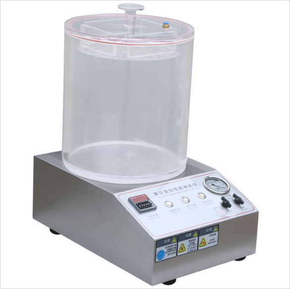通過對(duì)真空室抽真空,使浸在水中的試樣產(chǎn)生內(nèi)外壓差,觀測試樣內(nèi)氣體外逸情況,以此判定試樣的密封性能;通過對(duì)真空室抽真空,使試樣產(chǎn)生內(nèi)外壓差,觀測試樣膨脹及釋放真空后試樣形狀恢復(fù)情況,以此判定試樣的密封性能。