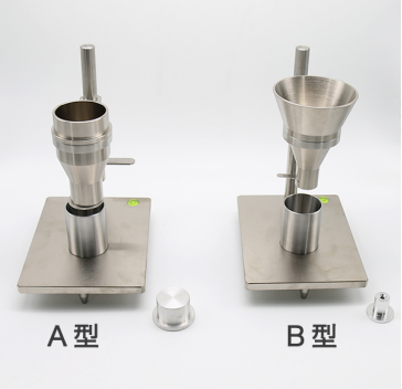 (3)迅速抽開擋料板,讓試驗(yàn)自由流進(jìn)測量圓筒,用刮板刮去測量圓筒上部多余的試樣并在天平上稱量圓筒中的試樣,精確至0.1克。